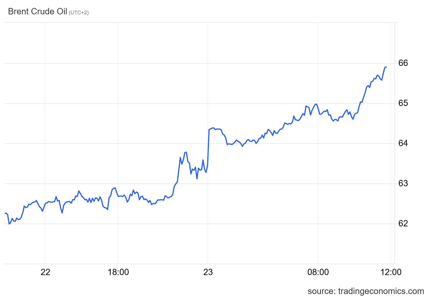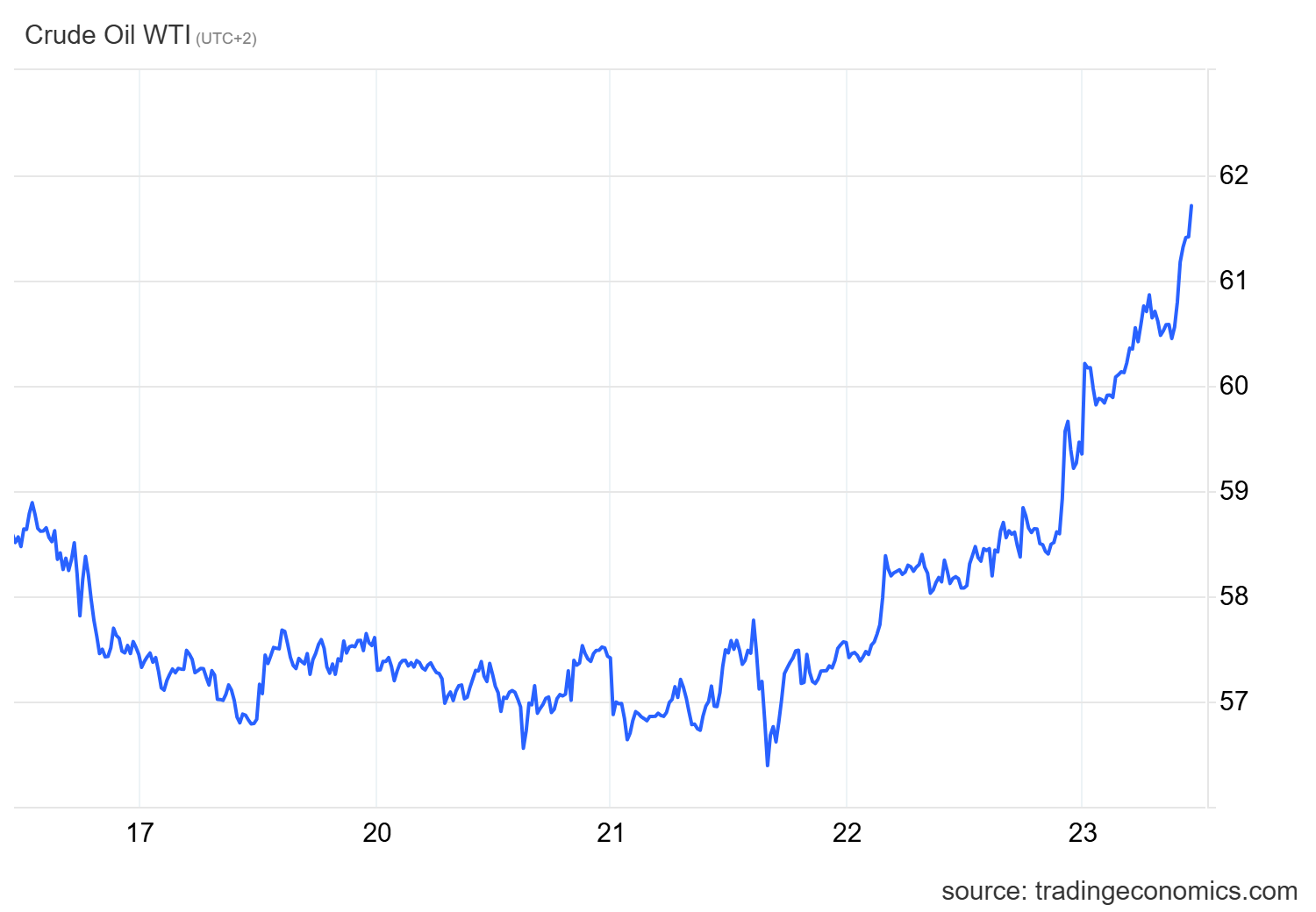 Allo stesso modo, il West Texas Intermediate (WTI) americano è salito, in questo momento (CET 11.45) di oltre il 5,00%, raggiungendo i 61,70 dollari. Ecco il relativo grafico: