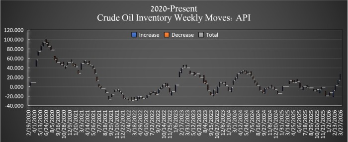 L’American Petroleum Institute (API) ha stimato che le scorte di petrolio greggio negli Stati Uniti siano aumentate di 3,719 milioni di barili nella settimana terminata il 3 aprile. Nella settimana precedente, le scorte statunitensi di petrolio greggio erano aumentate di 10,263 milioni di barili. Gli analisti si aspettavano un calo di 1,598 milioni di barili.
