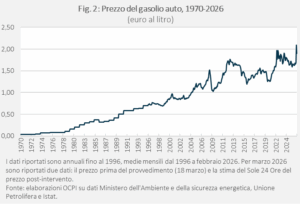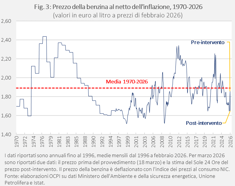 Dopo l’attacco di Stati Uniti e Israele all’Iran il prezzo dei carburanti è salito molto, superando 1,80 euro al litro per la benzina e 2 euro per il gasolio. Ciò ha spinto il governo a tagliare le accise di 20 centesimi, con un taglio complessivo dell’imposizione di 24,4 centesimi tenendo conto del calo dell’IVA: a parità del prezzo pre-imposte, il prezzo dovrebbe scendere a 1,65 euro al litro per la benzina e a 1,90 per il gasolio. Considerando i prezzi al netto dell’inflazione, il livello pre-intervento della benzina non era particolarmente alto, essendo in linea con la media degli ultimi 55 anni. Dopo l’intervento, il prezzo scenderebbe a un livello tra i più bassi in oltre mezzo secolo. Il prezzo del gasolio era invece superiore alla media degli ultimi vent’anni, che però era tenuta bassa dalla più contenuta imposizione su questo carburante; dopo l’intervento si riavvicinerebbe alla media, restando di poco superiore.