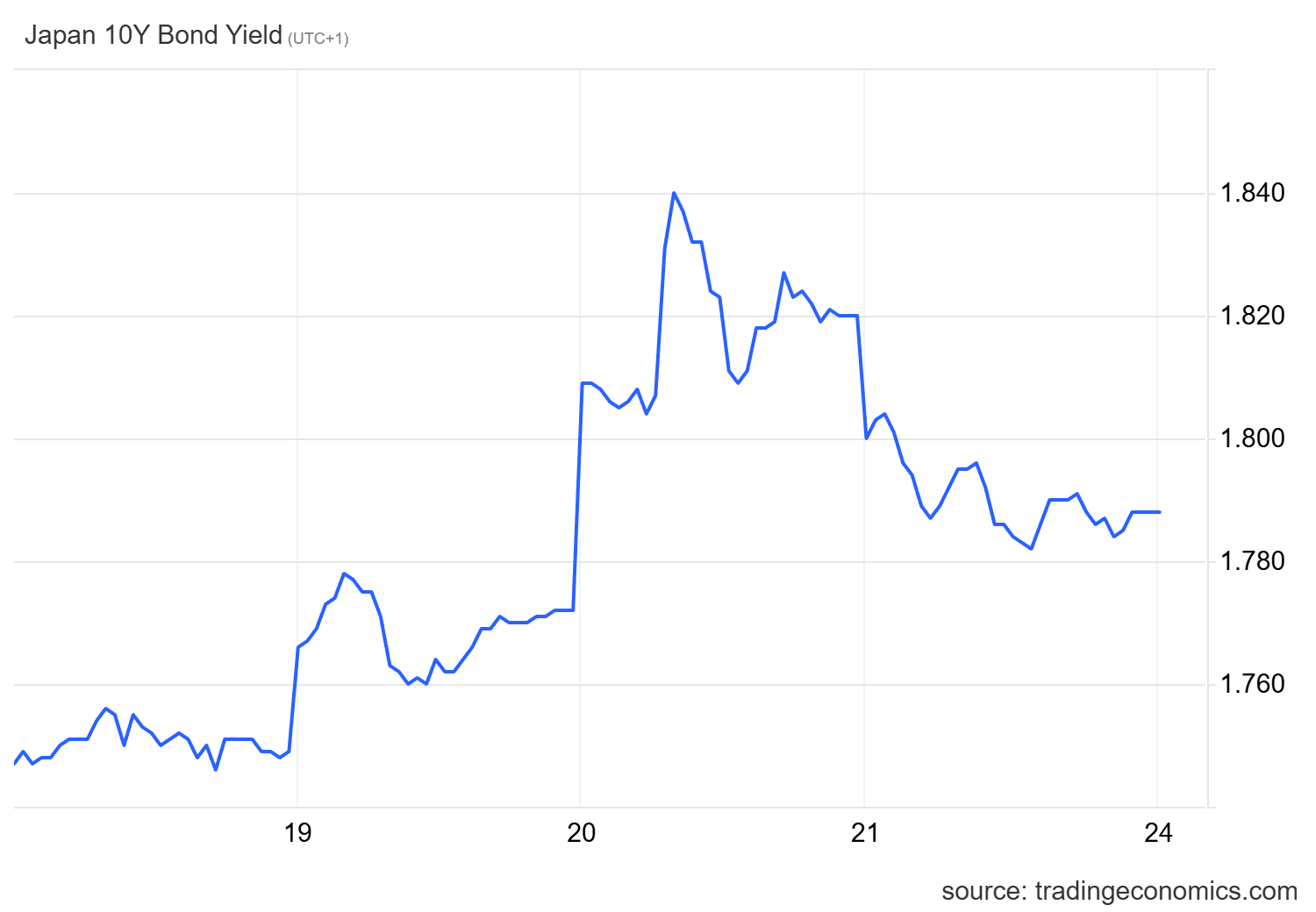 - Giappone: I rendimenti sono saliti a circa l’1,82%. L’inflazione è tornata (finalmente, direbbero a Tokyo) e il governo sta spingendo con stimoli che richiedono maggior debito, alzando i tassi.