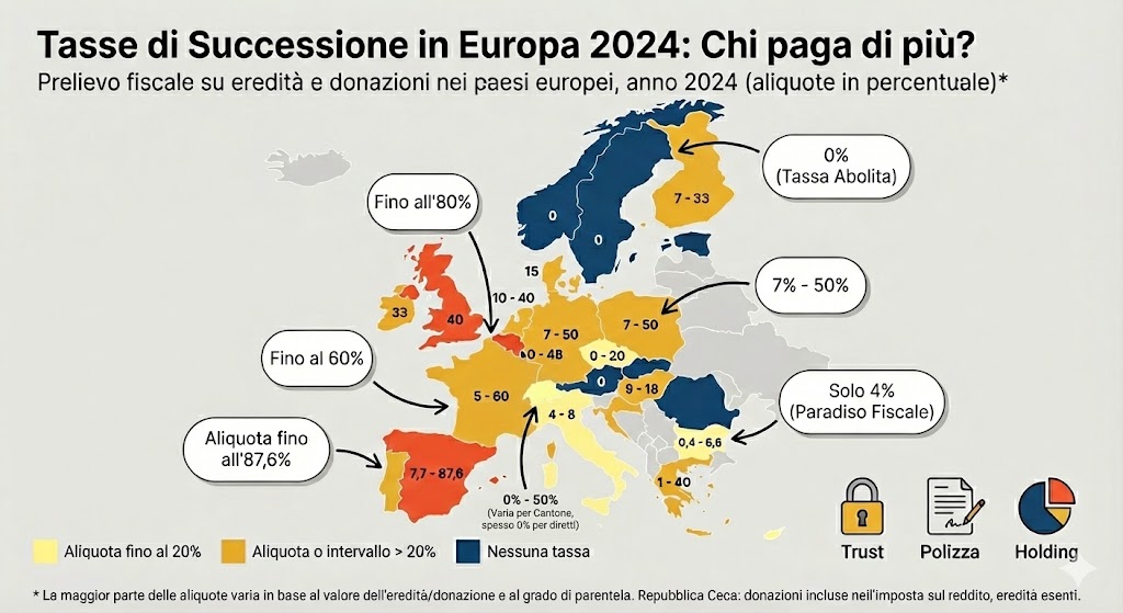 Eredità in Europa: la mappa 2024 svela enormi disparità. Mentre Spagna e Francia stangano fino all’80%, l’Italia resta un paradiso fiscale (4%). Ma attenzione a Svezia e Austria: ecco dove morire non costa nulla e come proteggere il patrimonio.