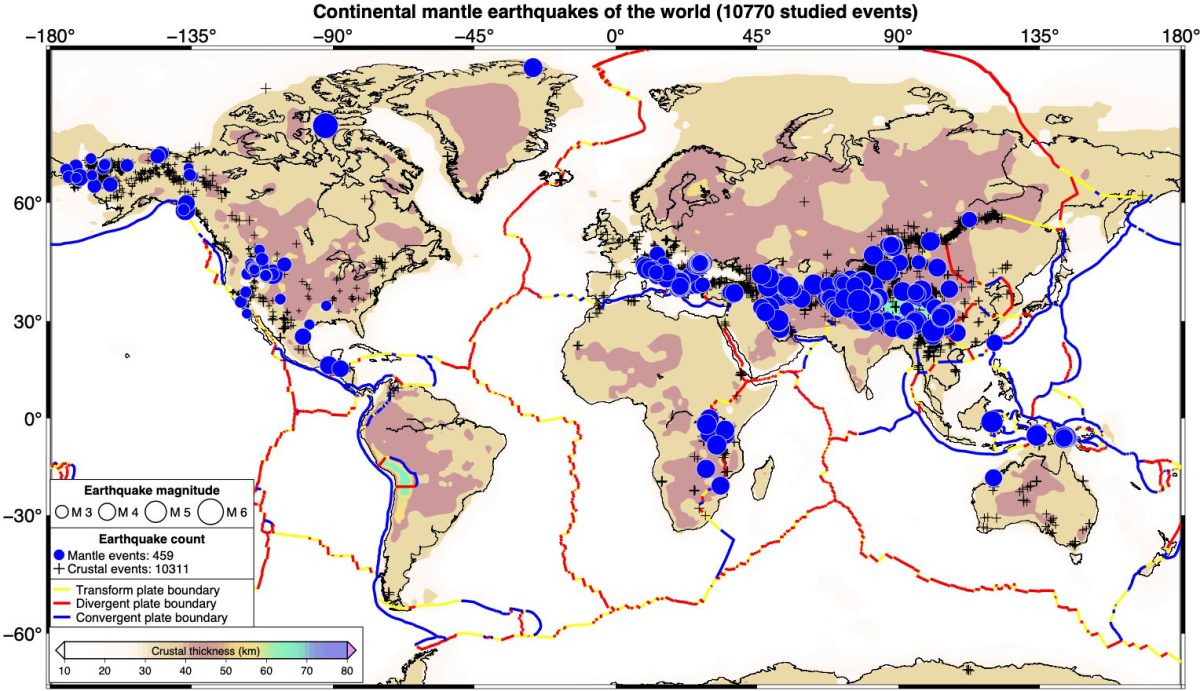 Applicando questo nuovo algoritmo a un vasto database globale, e partendo da oltre 46.000 eventi sismici registrati negli ultimi decenni, i ricercatori hanno isolato 459 terremoti del mantello continentale avvenuti dal 1990 a oggi. Sono rappresentati nell’immagine 1 che vedete al di sopra.