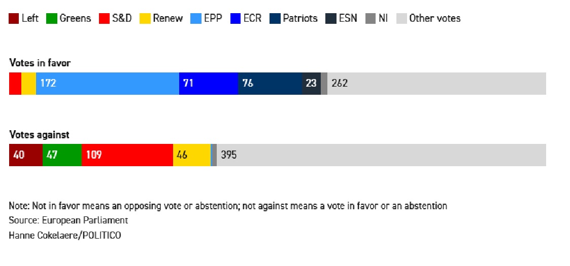 | Renew (Liberali) | Diviso | 17 deputati hanno “tradito” la linea ufficiale votando con la destra. |