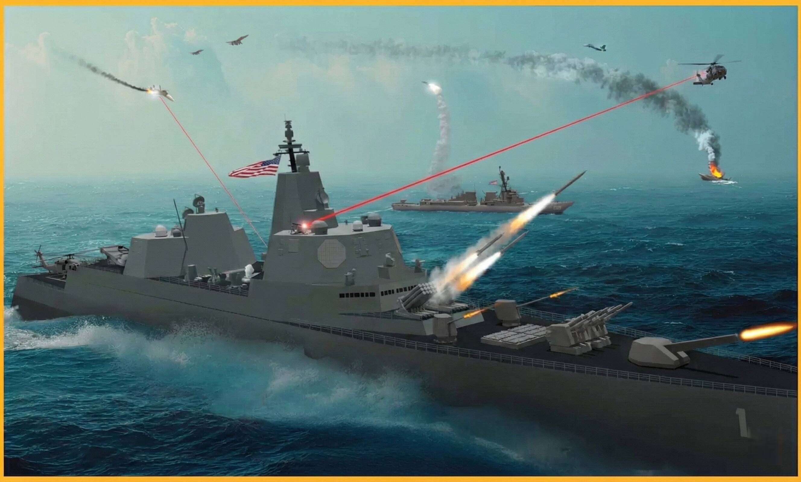 - Armamento principale: Cannoni elettromagnetici (Railgun) a prua, capaci di colpire oltre l’orizzonte, affiancati da cannoni Mark 45 da 127mm.