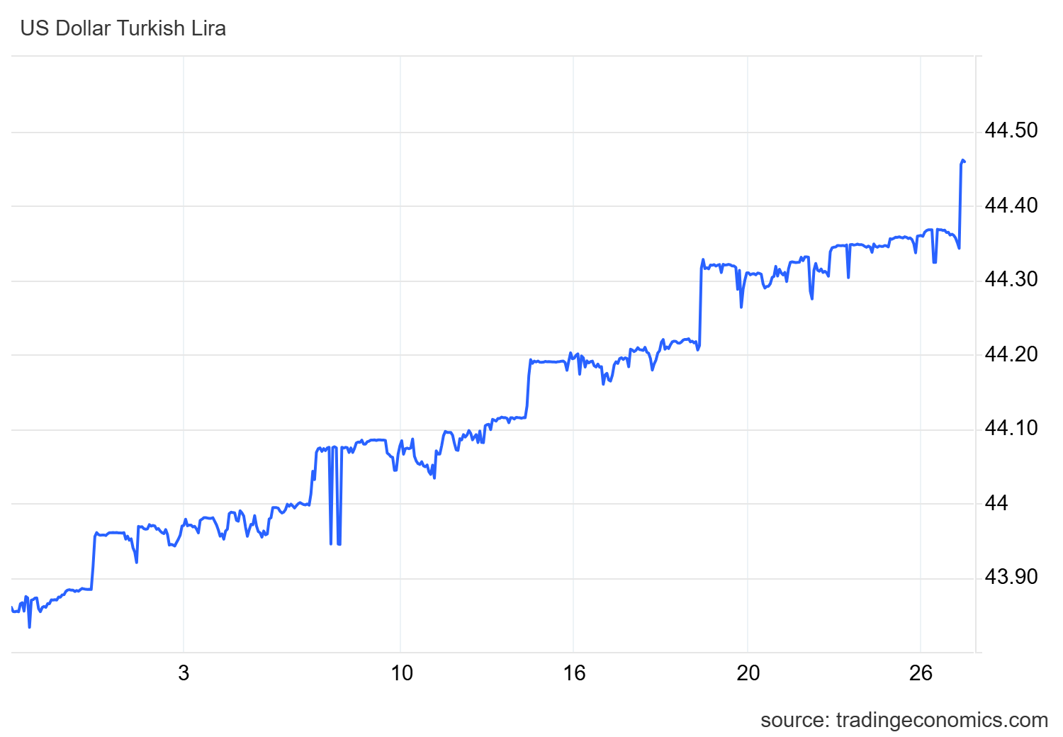 Sebbene la composizione esatta delle vendite non sia del tutto trasparente, sappiamo che una parte è stata venduta a pronti sul mercato, ma la maggioranza è stata impiegata per ottenere valuta estera o lire tramite accordi di swap. Si tratta, in sostanza, di prestiti in dollari collateralizzati in oro. Non è una pratica inusuale per le banche centrali, che garantisce al Paese finanziamenti in dollari a basso costo utilizzando le riserve auree come sicura garanzia. Del resto la Lira turca continua asvalutarsi rispetto al Dollaro USA, e questo non è cessato nell’ultimo mese. Ecco perché Ankara ha bisogno di valuta forte. Qui il cambio USd-Lira:
