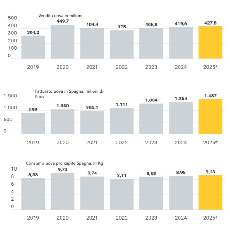 Gli spagnoli comprano più uova (+3,4% in volume), ma il valore delle vendite è esploso, passando da circa 1 miliardo di euro nel 2020 a quasi 1,5 miliardi attuali.