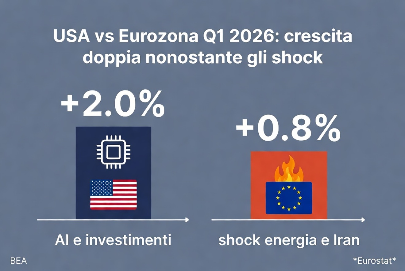 USA crescono il doppio dell’Eurozona nel Q1 2026: +2% contro +0,8%. L’AI spinge gli Stati Uniti, la crisi iraniana frena l’Europa