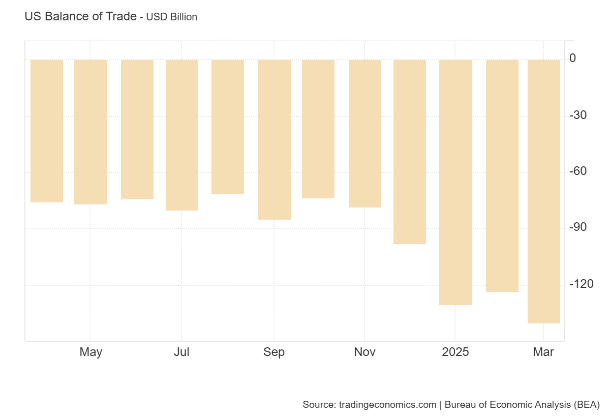 Potrebbe essere il picco prima di una forte discesa. Il deficit commerciale degli Stati Uniti è salito a 140,5 miliardi di dollari nel marzo 2025, raggiungendo un nuovo record, rispetto alle previsioni di un deficit di 137 miliardi di dollari.