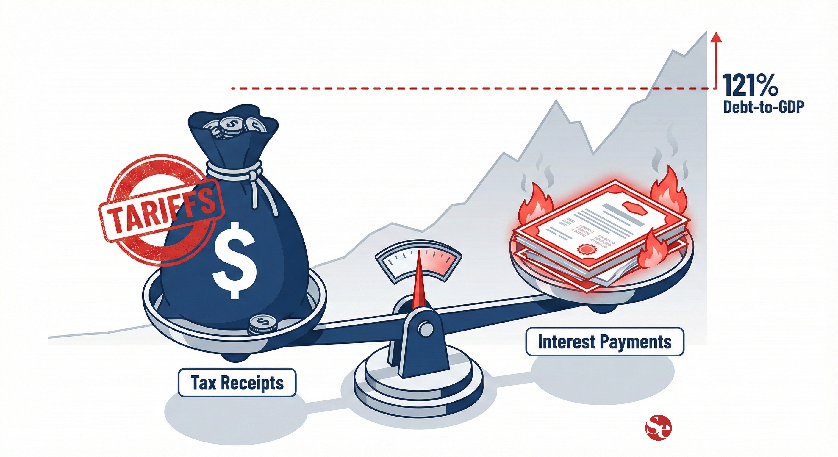 Perché è una notizia “buona”? Perché questo rapporto è in calo per il quarto trimestre consecutivo. Il recente picco negativo si era verificato nel Q3 2024, quando il rapporto aveva toccato il 37,5%, il livello peggiore dal 1996. La discesa al 33,2% indica che le entrate fiscali (spinte da inflazione e dazi) stanno correndo più veloci della spesa per interessi.