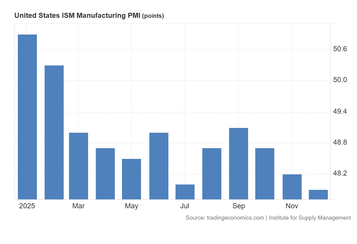 L’ultimo rapporto ISM (Institute for Supply Management) di dicembre 2025 ha scoperchiato il vaso di Pandora di questa contraddizione. Il PMI Manifatturiero, indice previsionale, è crollato a 47,9%, segnando il decimo mese consecutivo di contrazione. Questo è un dato Soft, basato su sondaggi, sentiment e aspettative. E sta raccontando una storia diametralmente opposta a quella della “resilienza” del PIL. Ecco il relativo grafico.